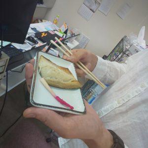 Gさん ピンクのショウガ『はじかみ』を嚙みかみ。