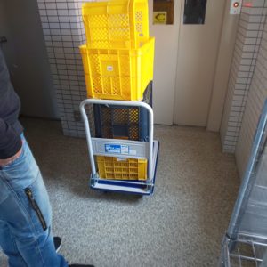 ミニコンを文明の利器を使い運ぶ人々。